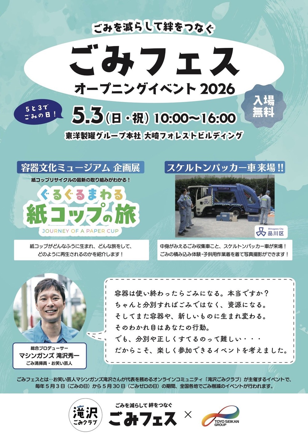 2026年5月3日(日・祝)、大崎フォレストビルディングにて、「ごみフェス」オープニングイベント2026 が開催されます。