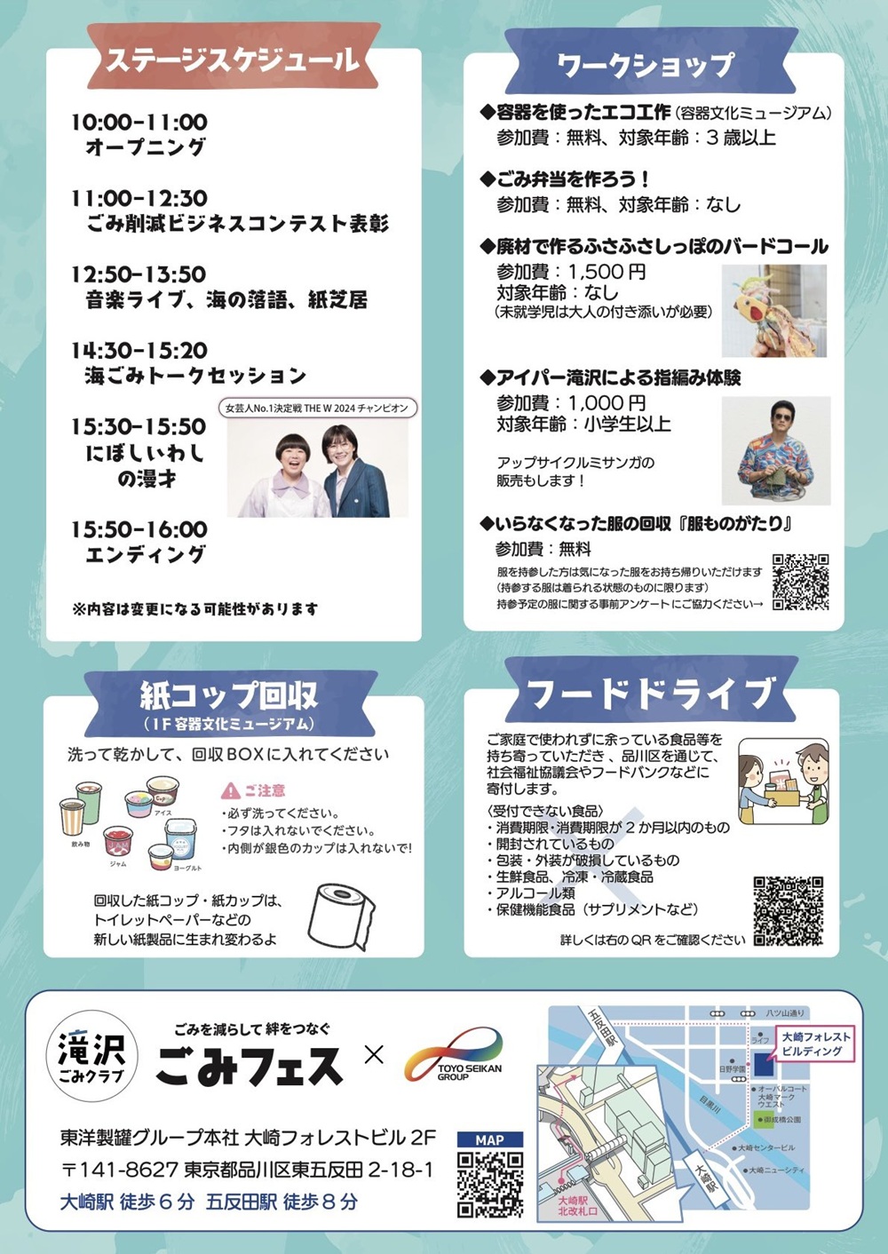 お笑い芸人でごみ清掃員のマシンガンズ滝沢さんが主宰する「滝沢ごみクラブ」が行う「ごみフェス」のオープニングとなる当イベント。今回はステージやワークショップ、フードドライブなど楽しい企画が盛りだくさんです。