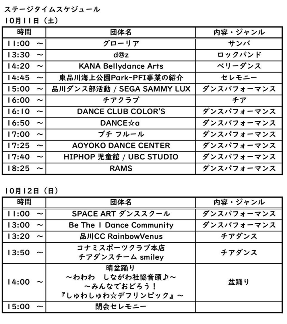 日時:10月11日(土)11:00~21:00 10月12日(日) 11:00~15:00 ※10月10日(金)は天王洲グラウンド企画のみ開催 場所:東品川海上公園・天王洲公園 内容:飲食ブース、屋台、ステージパフォーマンス、ふれあい動物園など