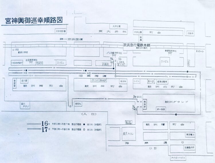 鮫洲八幡神社 例大祭の特徴は、深夜に行われる大神輿の宮出しです。16日(土)の午前2時を過ぎると、大拍子「よせの太鼓」が鳴り響き、2時半よりみたま移し式、3時から宮出しが行われます。大神輿は約4時間、朝7時までかけて御旅所まで担がれます。大神輿の宮納めは、翌17日(日)午後3時から。御旅所を発御し、午後6時に無事神社へ帰社されます。
