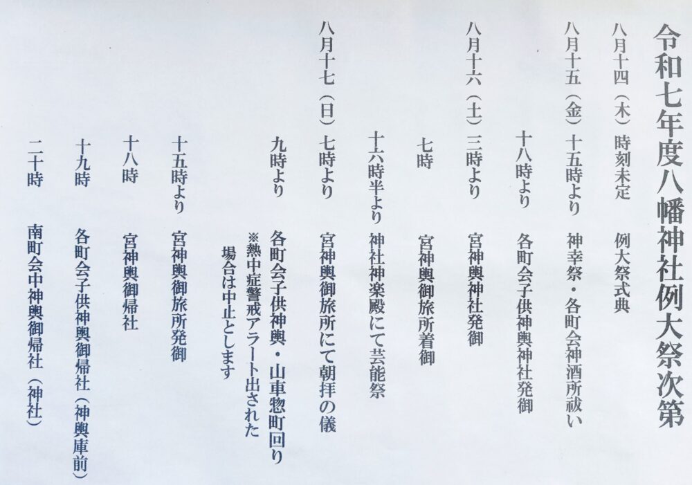 2025年8月14日(木)~17日(日)、鮫洲八幡神社 例大祭が行われます。(8月14日は例大祭式典となり神社総代のみで執り行われます)