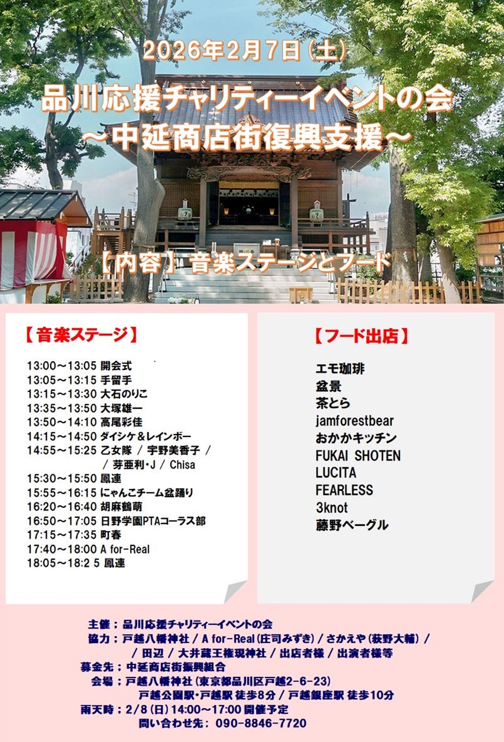 2026年2月7日(土)、戸越八幡神社にて「品川応援チャリティーイベントの会 〜中延商店街復興支援〜」が開催されます。