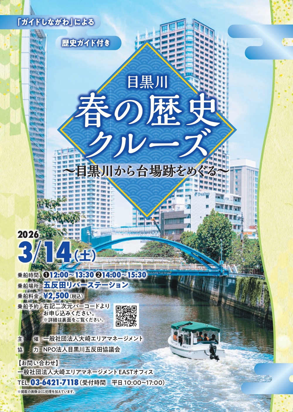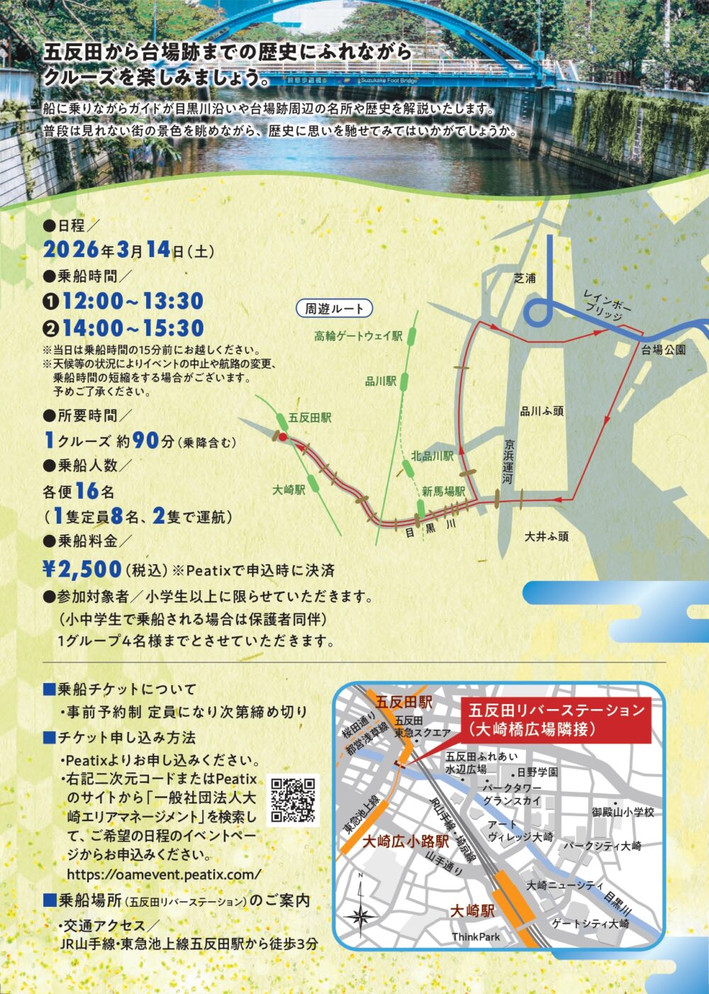 2026年3月14日(土)「目黒川 春の歴史クルーズ ~目黒川から台場跡をめぐる~」が運航します。
