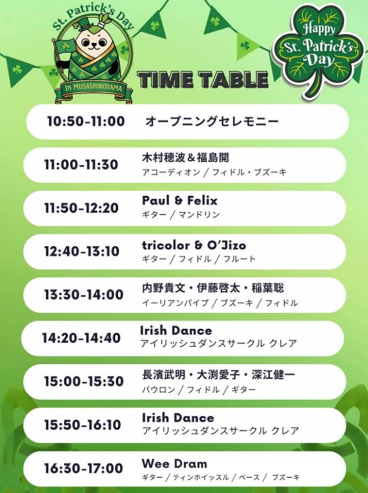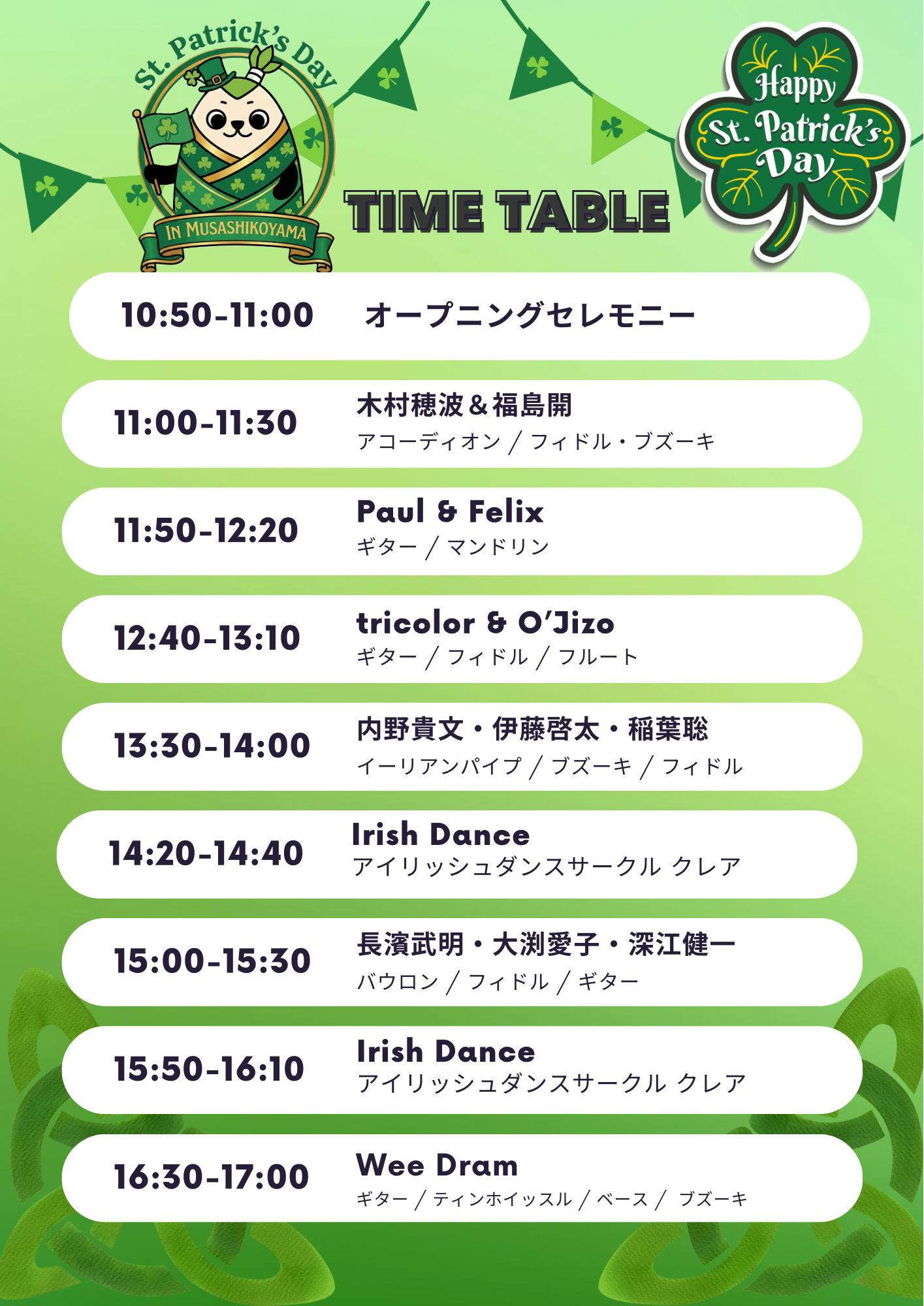 <ステージプログラム> 10:50~11:00 オープニングセレモニー 11:00~11:30 木村穂波&福島開(アコーディオン/フィドル・ブズーキ) 11 :50~12:20 Paul & Felix(ギター/マンドリン) 12:40~13:10 tricolor & O’Jizo(ギター/フィドル/フルート) 13:30~14:00 内野貴文・伊藤 啓太・稲葉 聡(イーリアンパイプ/ブズーキ/フィドル) 14:20~14:40 アイリッシュダンス(アイリッシュダンスサークル クレア) 15:00~15:30 長濱武明・大渕愛子・深江健一(バウロン/フィドル/ギター) 15:50~16:10 アイリッシュダンス(アイリッシュダンスサークル クレア) 16:30~17:00 Wee Dram(ギター/ティンホイッスル/ベース/ブズーキ)