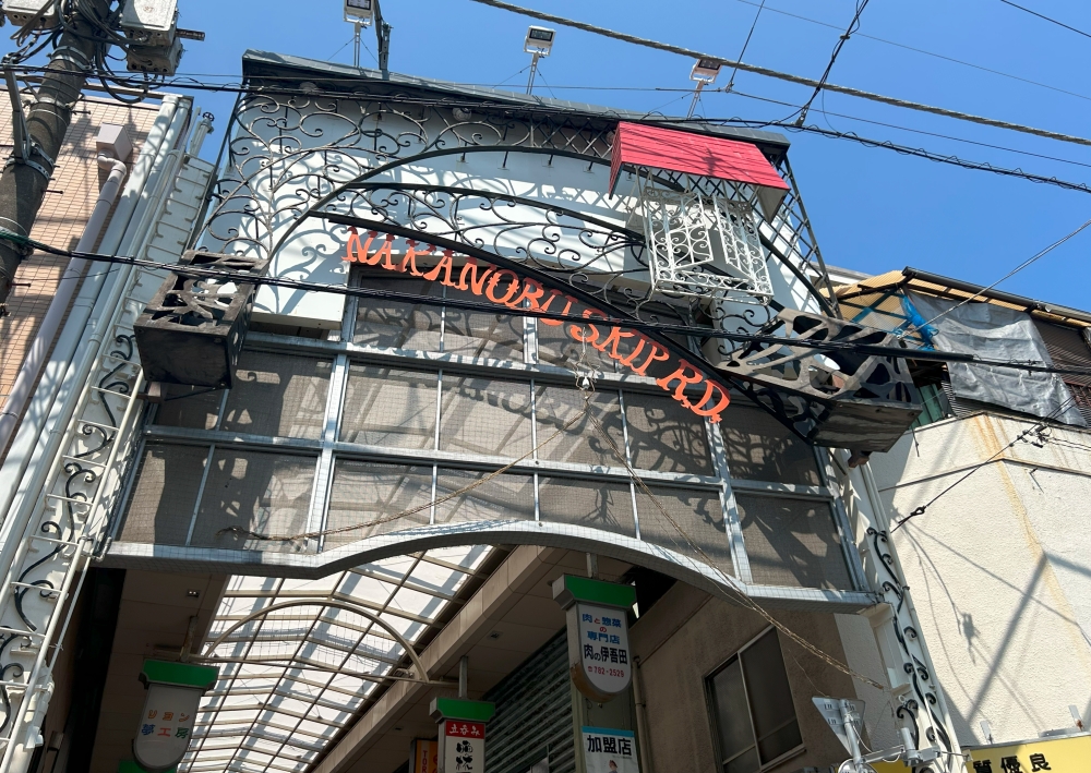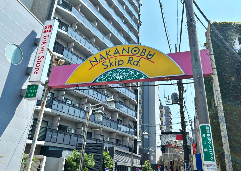 東急池上線・荏原中延駅と東急大井町線・中延駅から、それぞれ徒歩1分の距離にある「中延商店街(通称:なかのぶスキップロード)」。荏原中延駅側から向かうと、黄色い看板が出迎えてくれます。