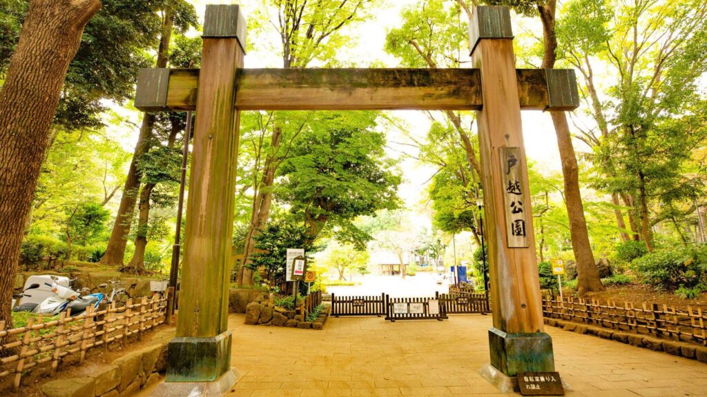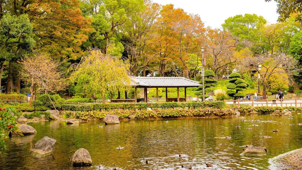 江戸時代、肥後国(熊本)藩主細川家の下屋敷の庭園跡を利用して造られた、品川区を代表する公園。池を中心に渓谷や滝、築山などの配置の中を一周する回遊式庭園で、薬医門(正門)、冠木門(東門)等、大名庭園の面影をとどめている。