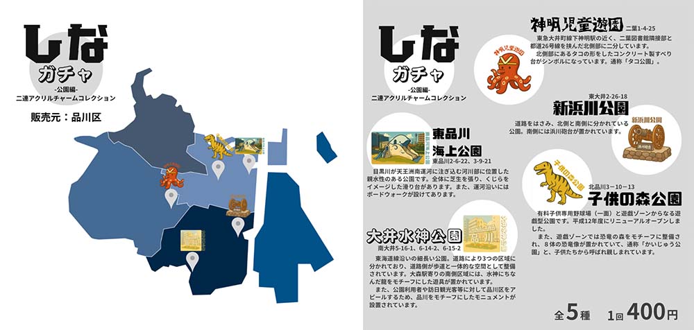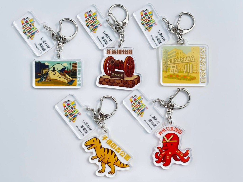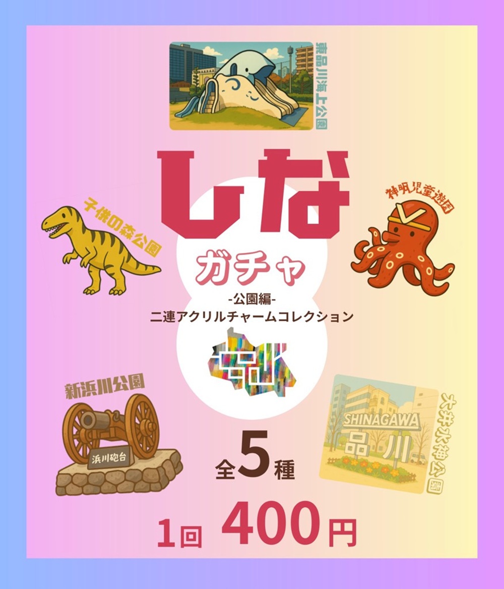 その名も「しなガチャ-公園編-2連アクリルキーホルダー」。 地元の人には「これ知ってる!」、初めて来た人には「こんな公園あるんだ!」と、品川の魅力をギュッと詰め込んだアイテムです。