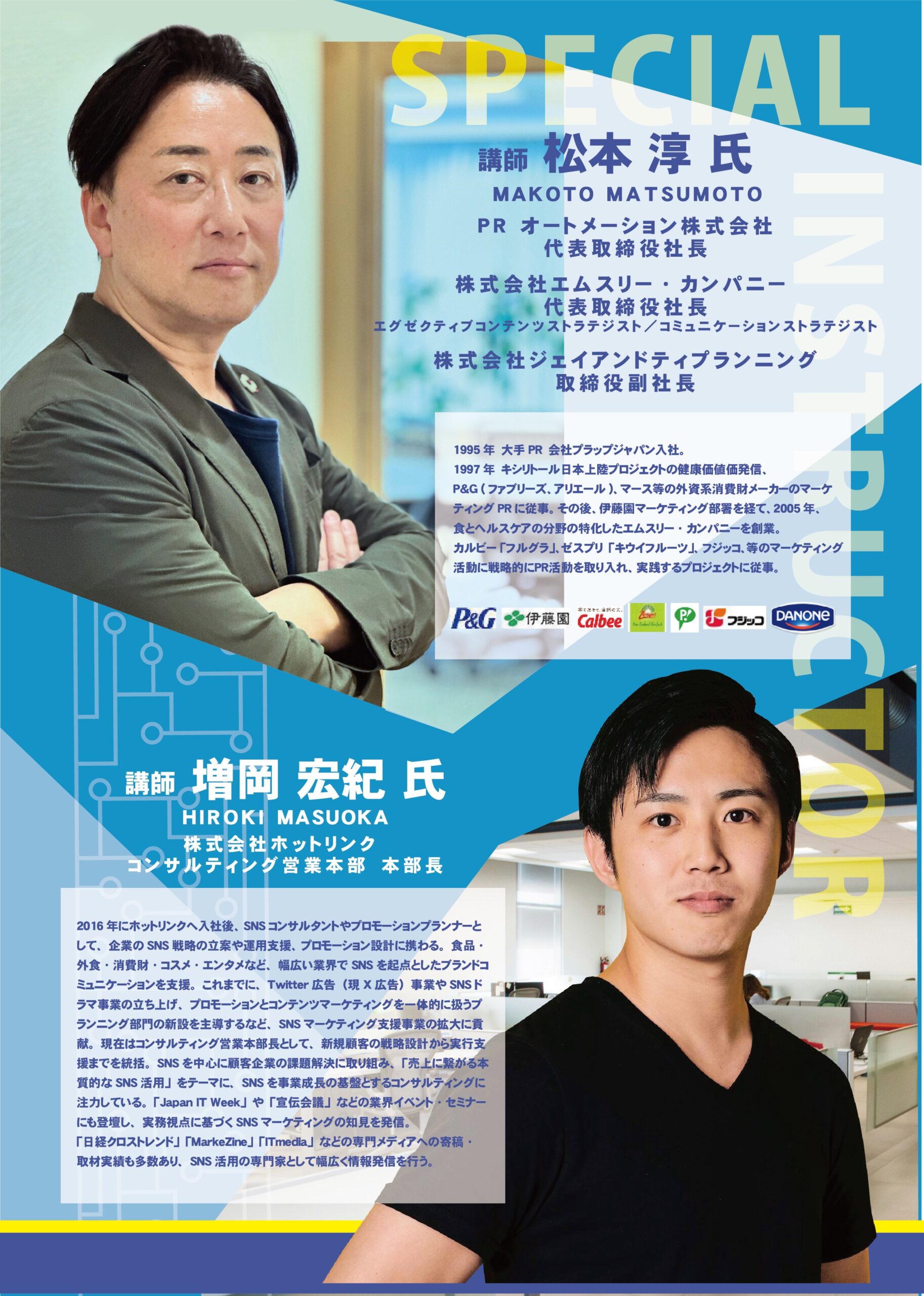 内 容:①講座  「AIで誰でも挑戦できる!低コストでPR効果を最大化する秘訣」「SNS to PR」をテーマに、外部に頼ることなく自社でPR活動を内製化し、低コストで効果を最大化する秘訣を、専門家を招いて具体的に解説いたします。