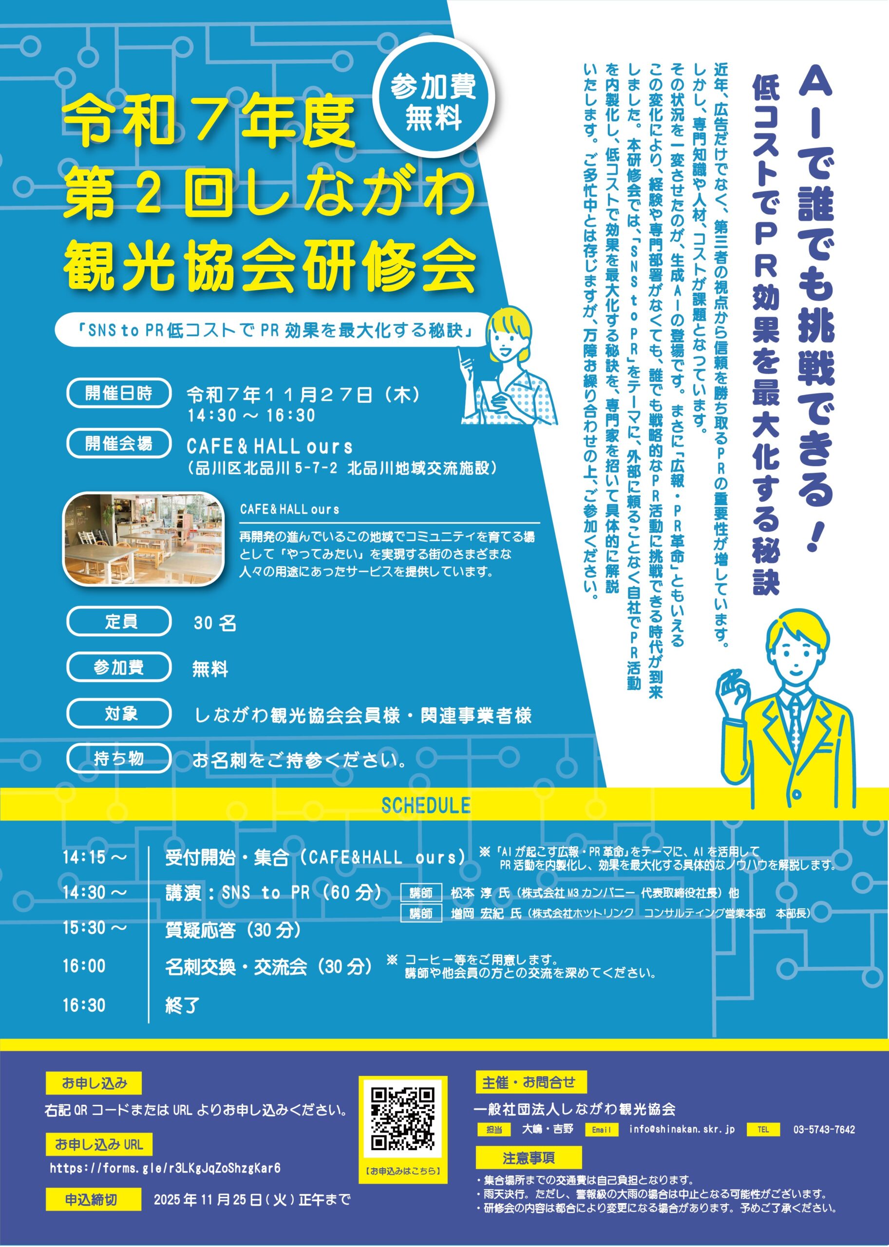 この度しながわ観光協会では、令和7年度第2回研修会を下記のとおり開催する運びとなりました。