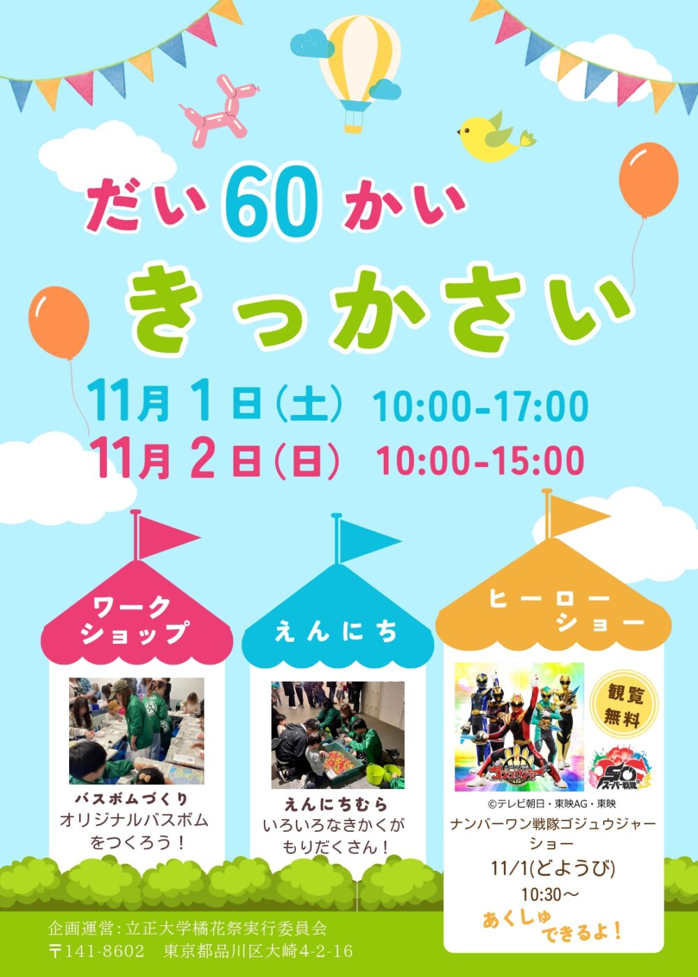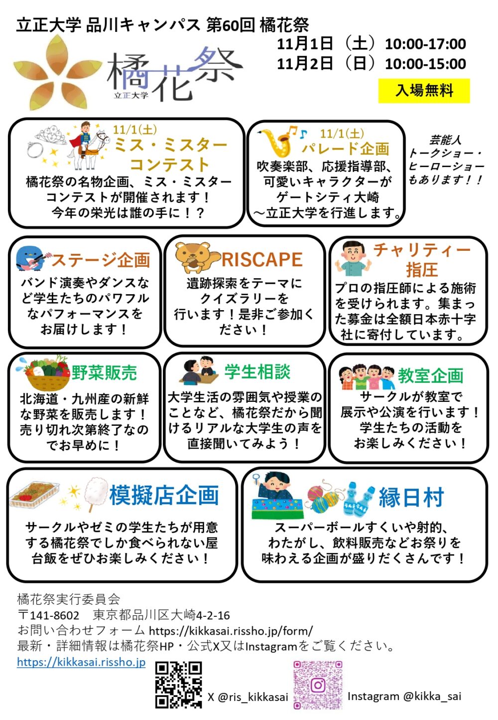 2025年11月1(土)、2日(日)、大崎駅近くの立正大学にて「橘花祭」が開催されます。